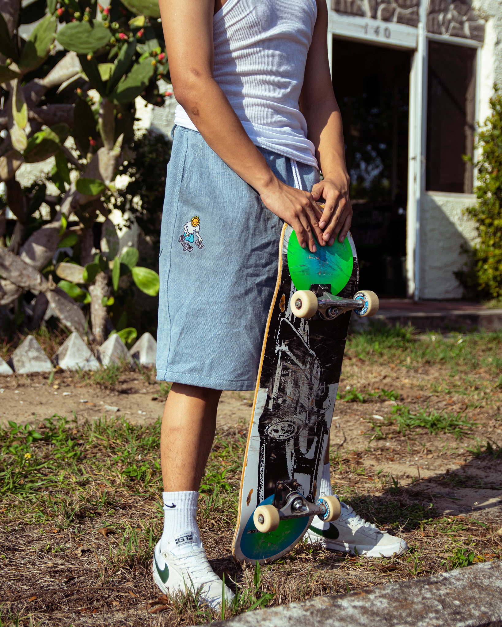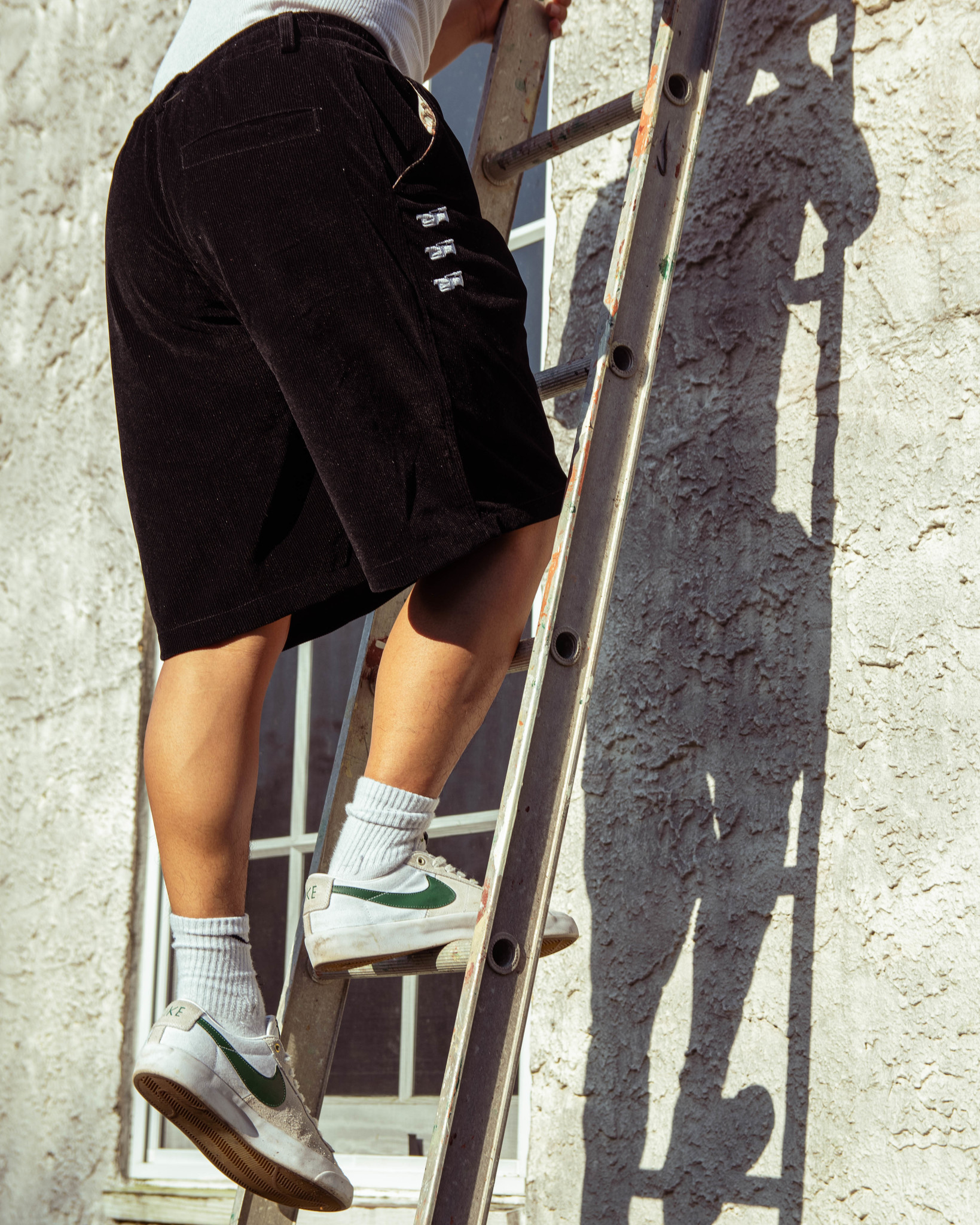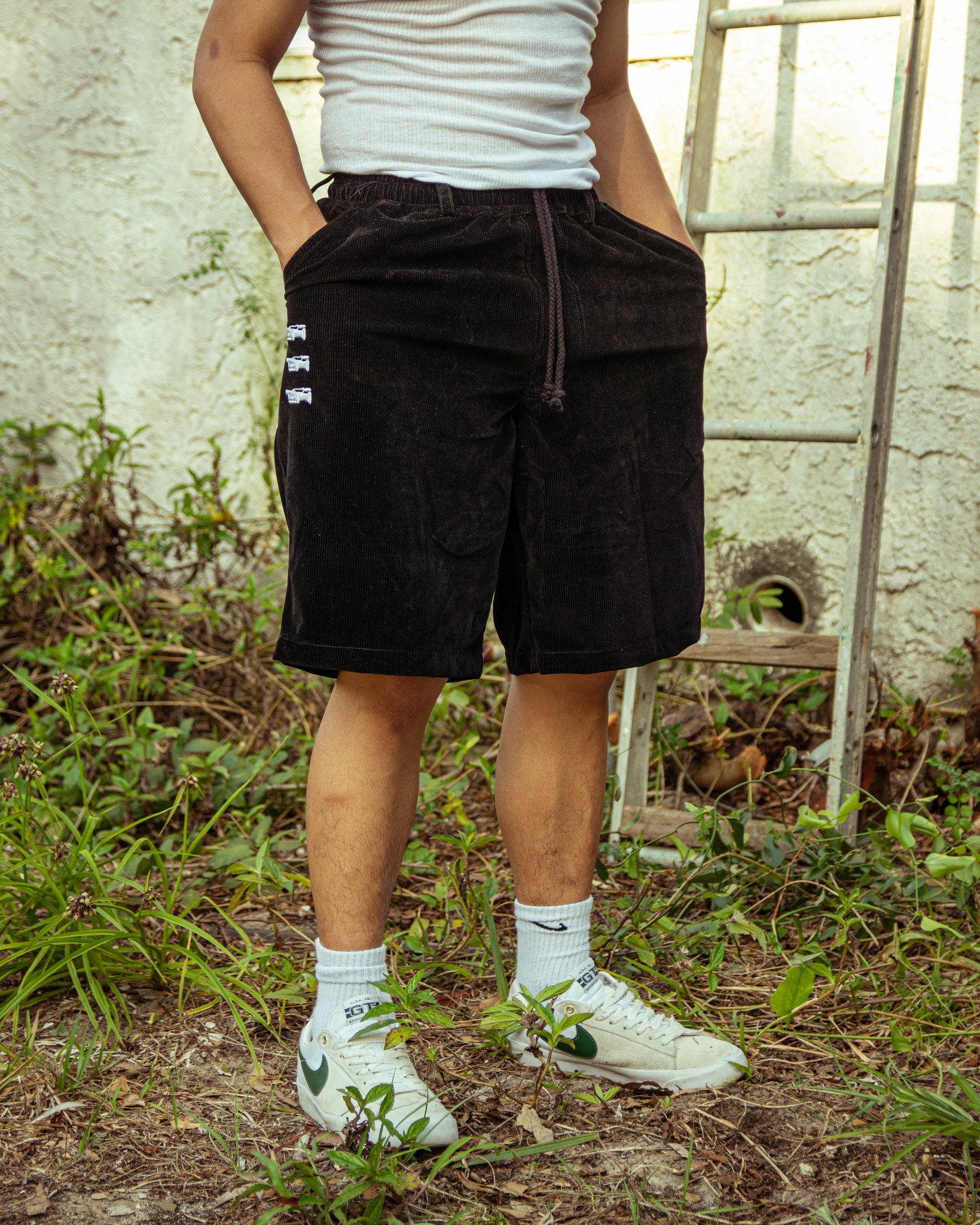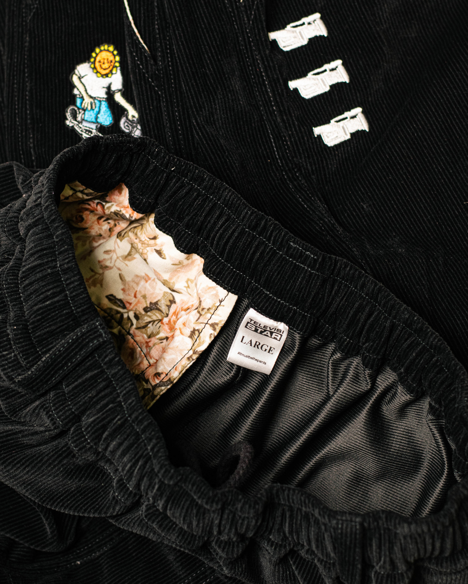 Next, we have the Light Blue Denim Short, featuring the Sunflower Filmer embroidery; as well as the Black Corduroy Short, which features the 3VX1 embroidery.