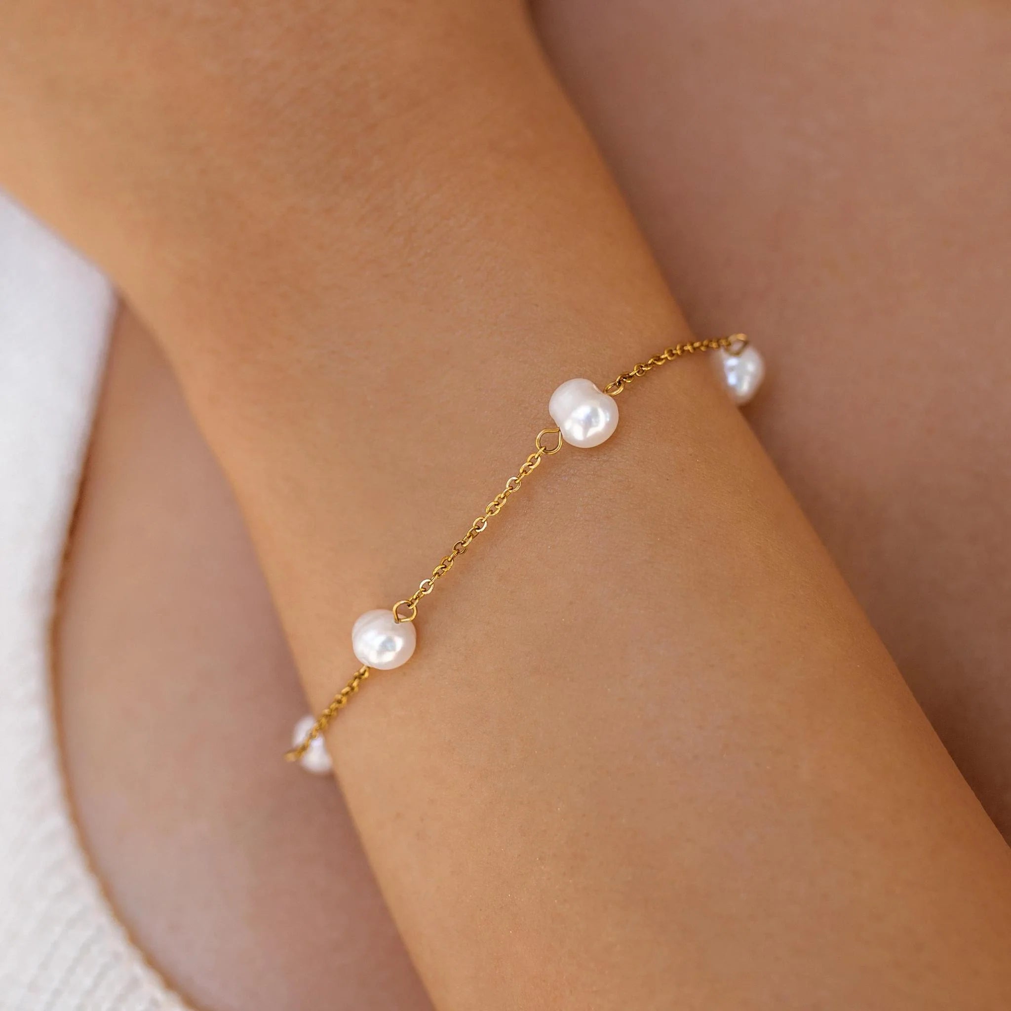 Rosemary bracelet in 18K gold-plated stainless steel features delicate freshwater pearls for elegant coastal charm. Hypoallergenic, nickel-free, and lead-free construction ensures comfortable wear for sensitive skin, while water-resistant finish maintains lasting brilliance.
