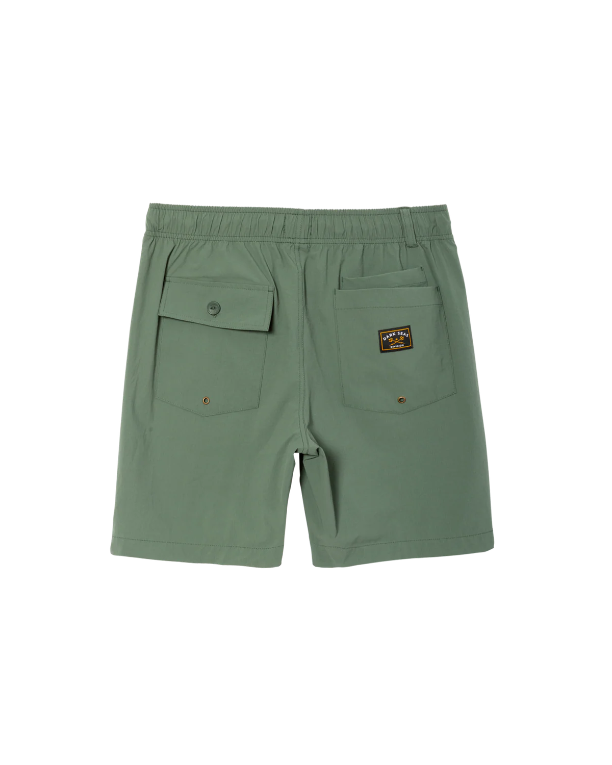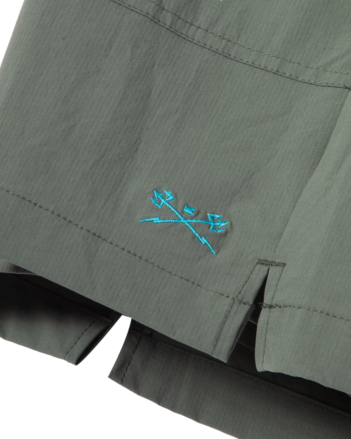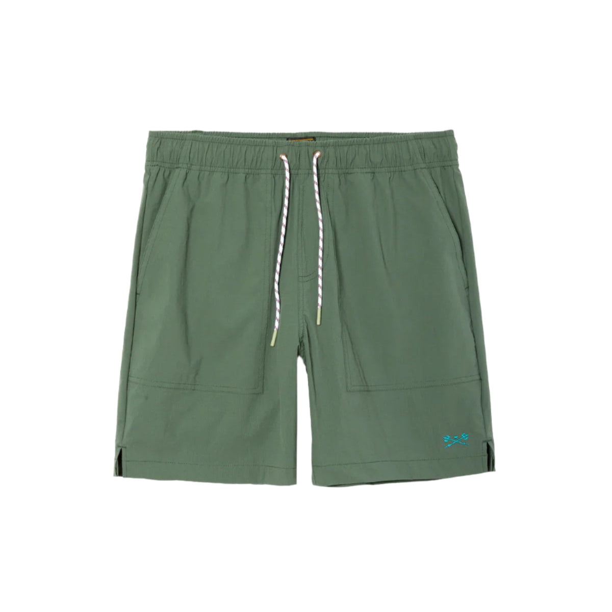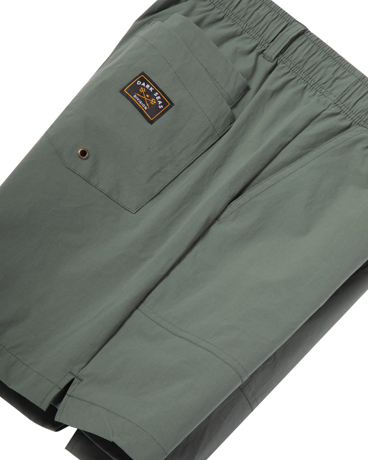 The Dark Seas Warwick Camp Short in Green is built from stretch nylon ripstop with an 18” outseam and elastic waist. Features front and back patch pockets, a secure zip pocket, and embroidered logo details.