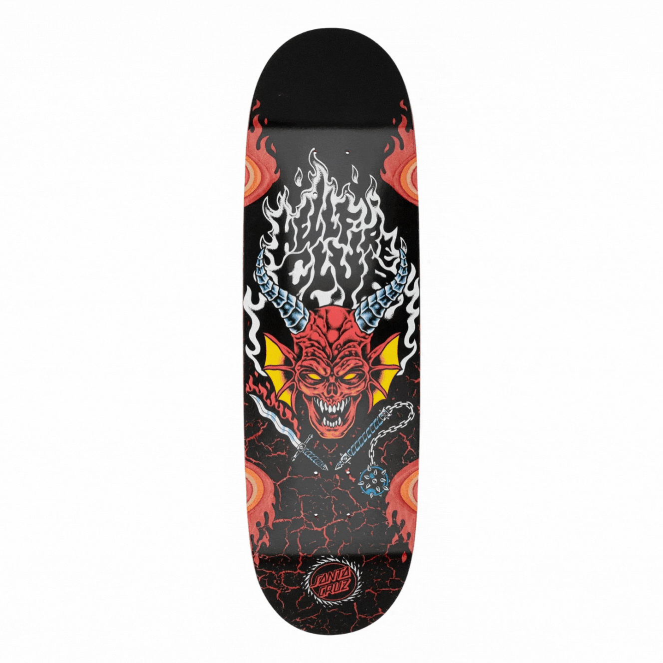 The Santa Cruz Stranger Things Hellfire Club Flames Deck turns up the heat from Hawkins to the Halfpipe. Featuring multicolor glow-in-the-dark flames and routered wheel wells exposing red, orange, and natural plys, this 9.0" egg-shaped deck rides as good as it looks. Built from 7-ply North American maple and pressed with epoxy for long-lasting pop, it’s finished with Santa Cruz’s ATV concave for all-terrain control and a compact 13.875" wheelbase for a tight, responsive feel.