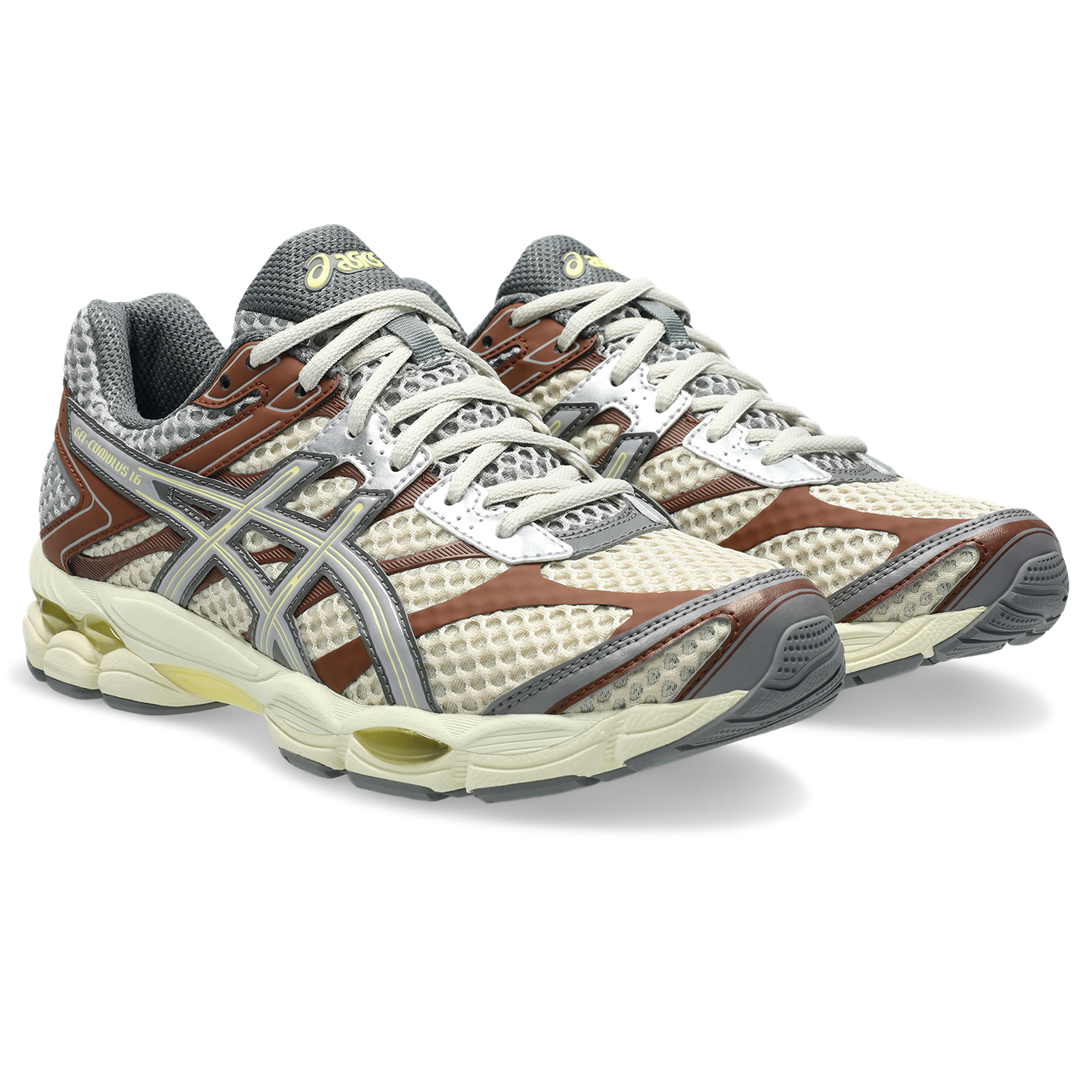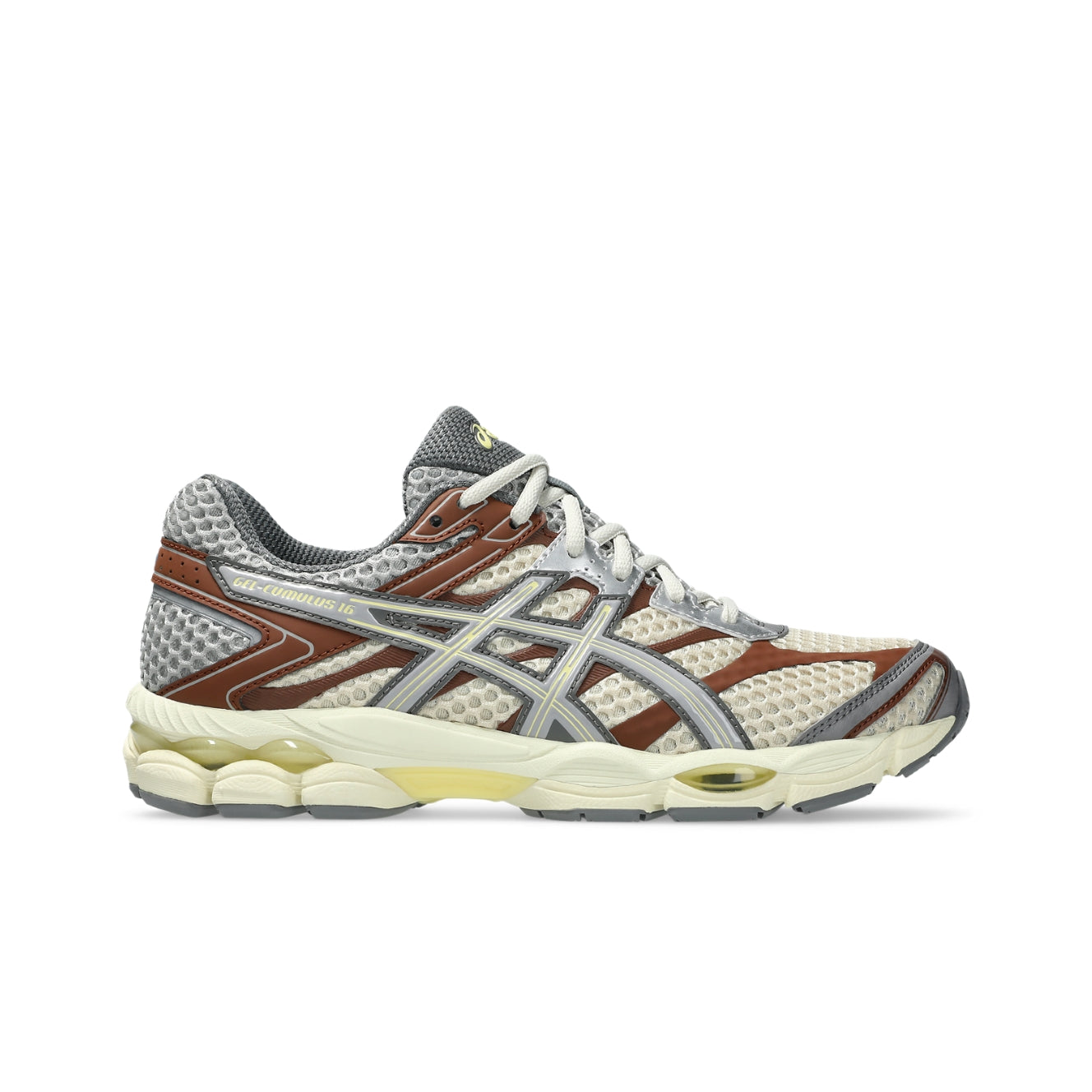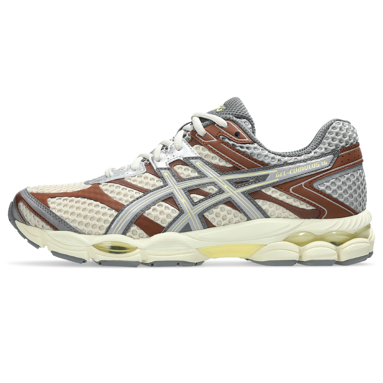 The Asics GEL-CUMULUS 16 Beige/Grey reintroduces a 2000s classic through a collaboration with Japanese label emmi. Designed with lightweight, responsive foam and advanced GEL cushioning, it delivers smooth transitions and lasting comfort. The two-tone open mesh upper enhances breathability, while silver and lemon-yellow accents create a refined, sport-luxe aesthetic