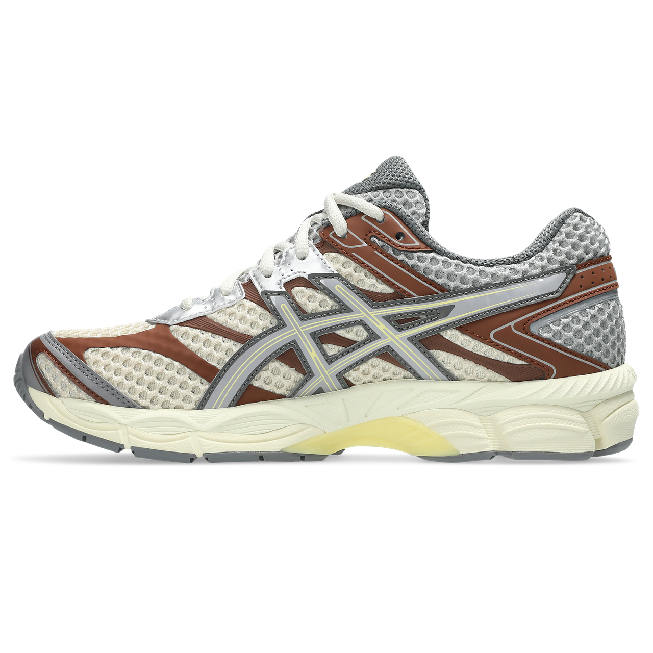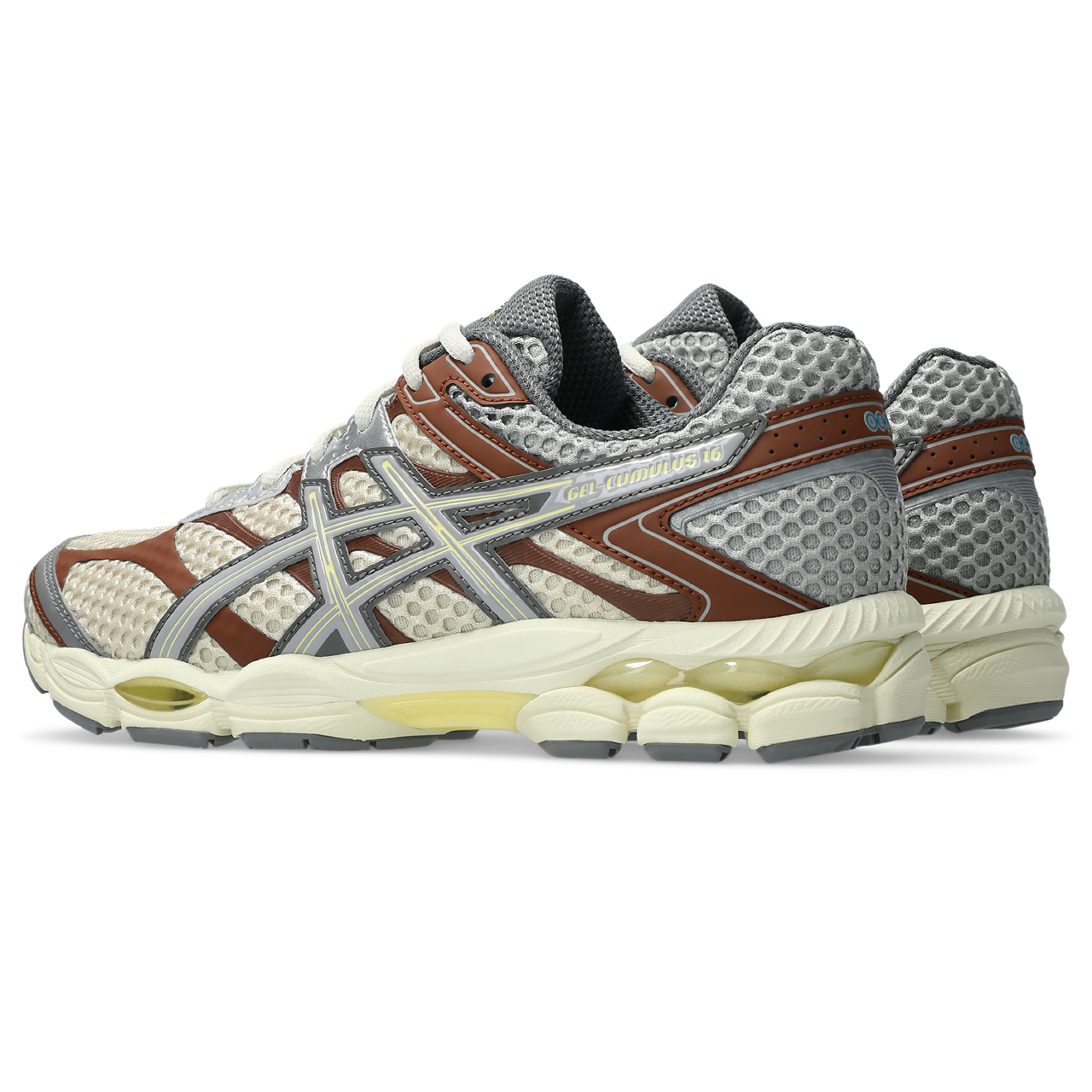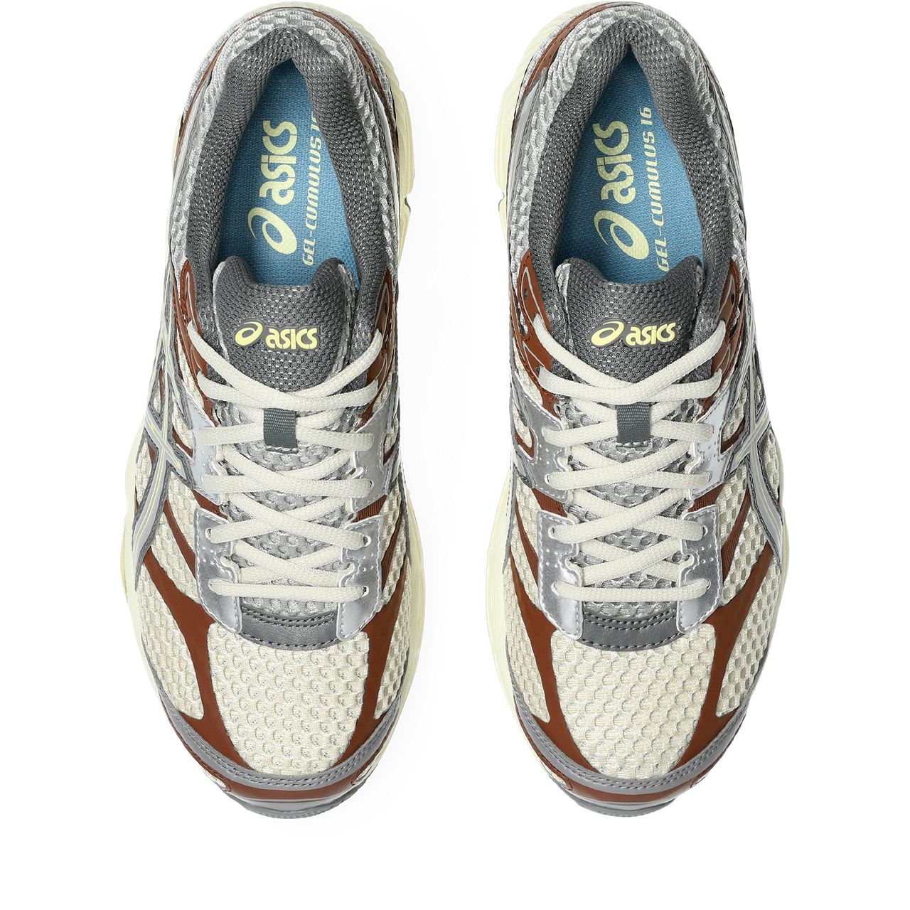 The Asics GEL-CUMULUS 16 Beige/Grey reintroduces a 2000s classic through a collaboration with Japanese label emmi. Designed with lightweight, responsive foam and advanced GEL cushioning, it delivers smooth transitions and lasting comfort. The two-tone open mesh upper enhances breathability, while silver and lemon-yellow accents create a refined, sport-luxe aesthetic