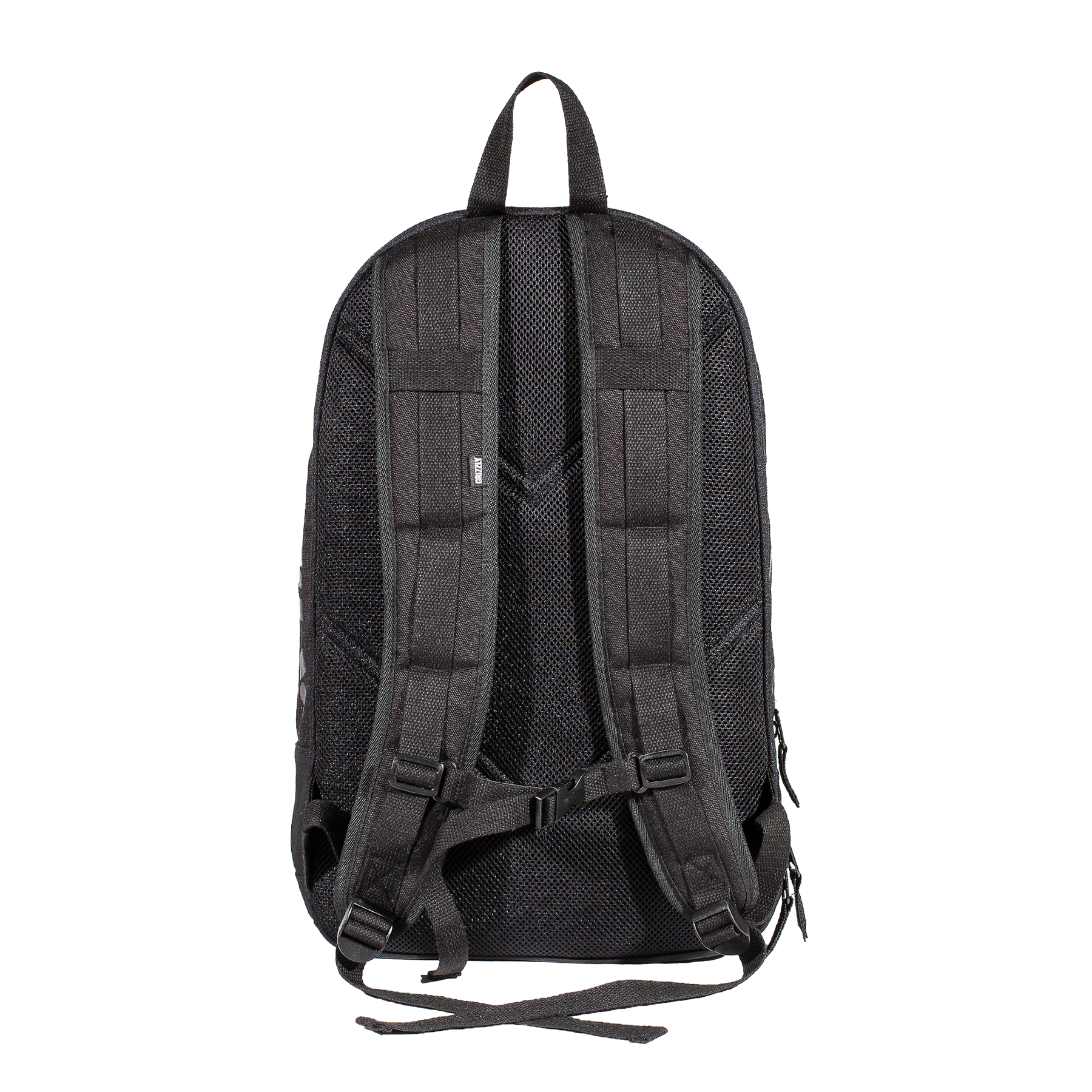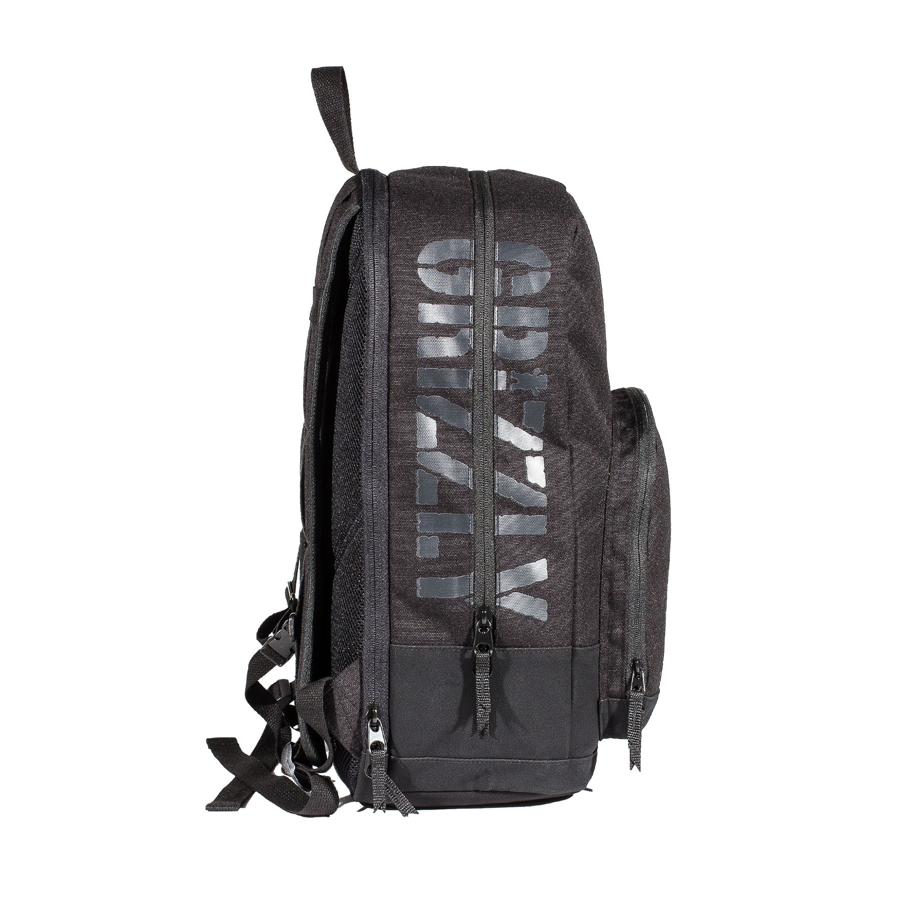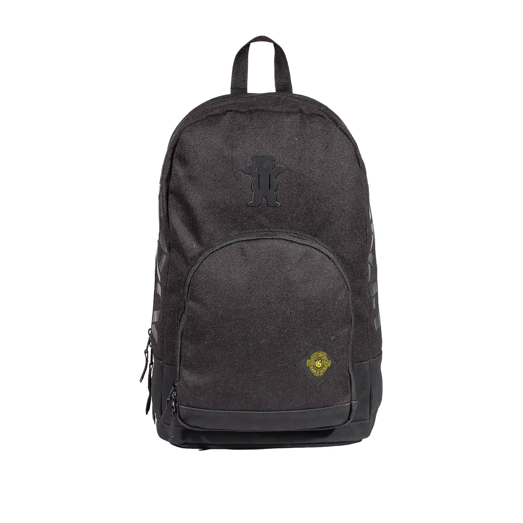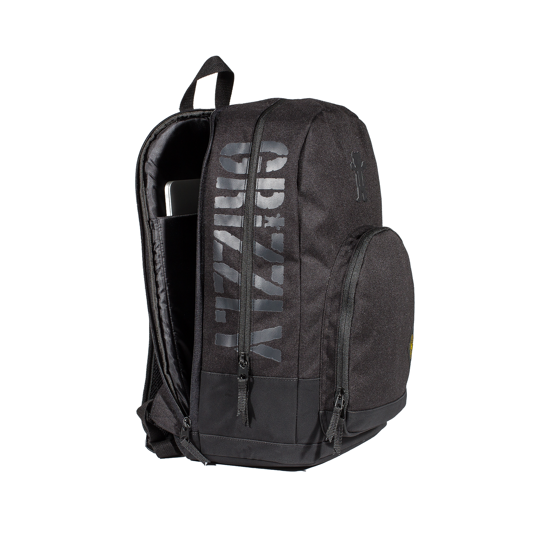 The Grizzly G-Script Backpack in Black features heavy-duty zippers with suede pulls, a multi-function interior with padded 15" laptop compartment, and printed side panels. Finished with extra padded shoulder straps and a woven G-Script label.