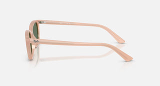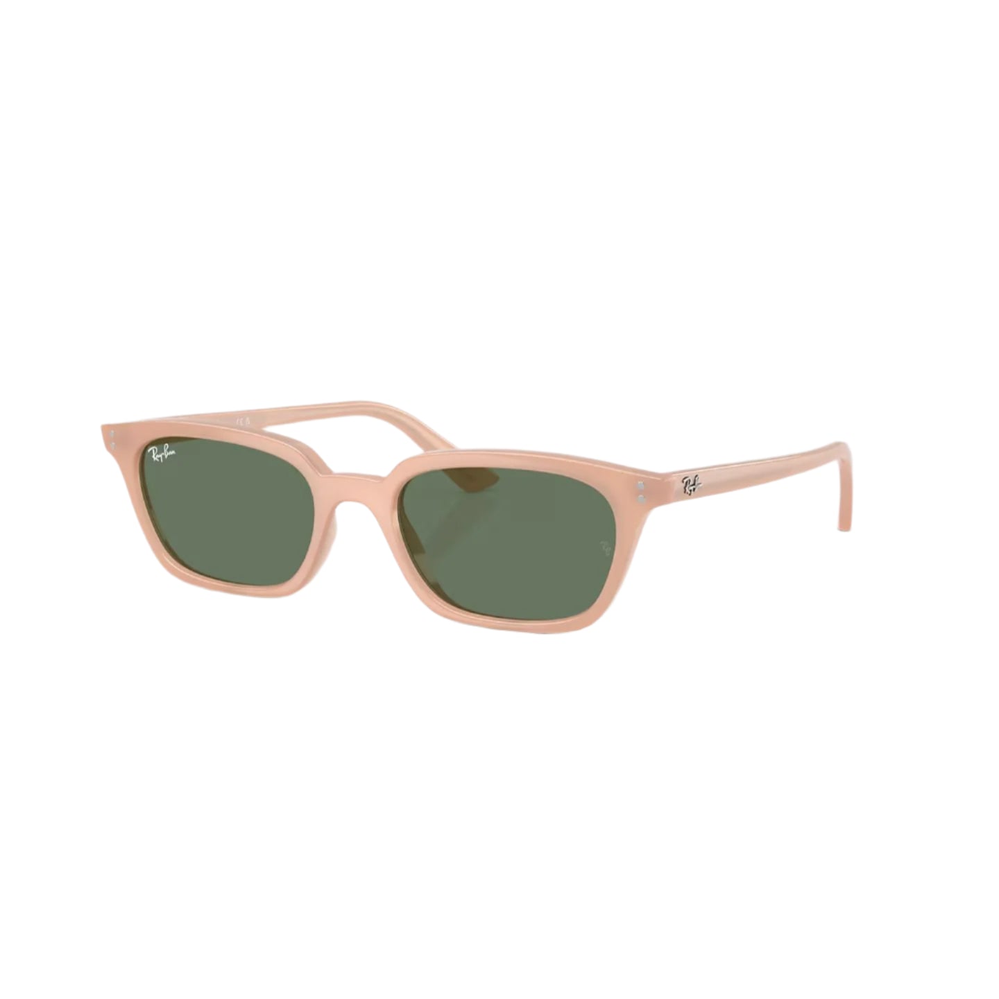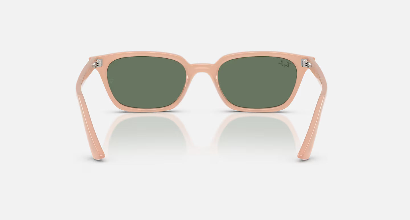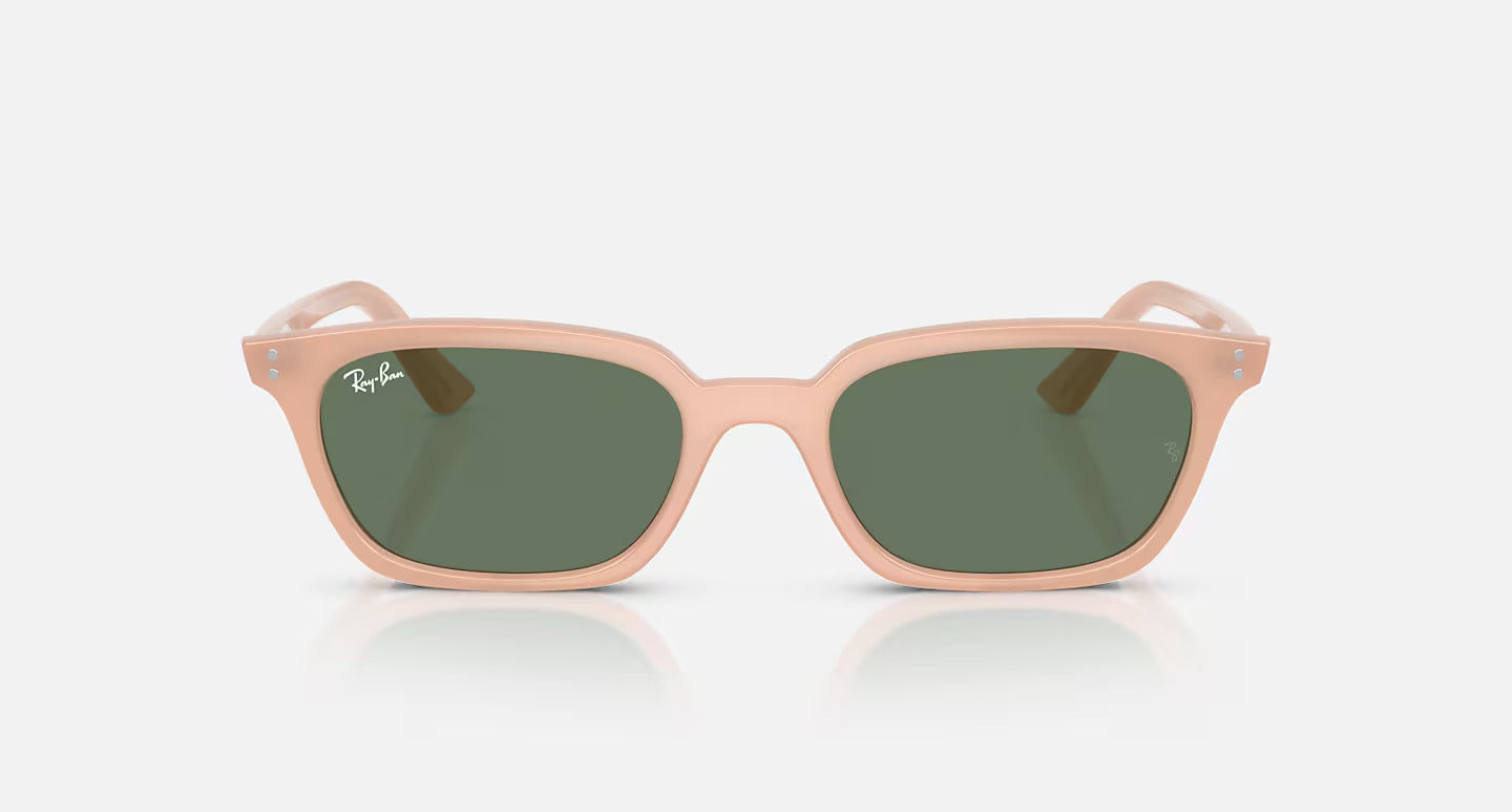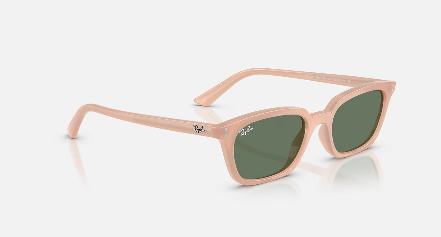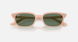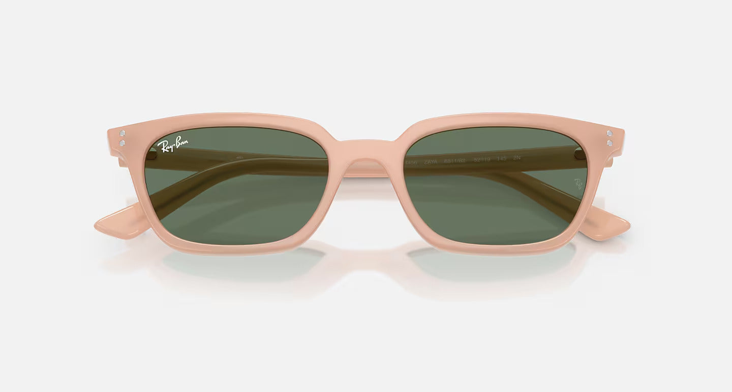 Ray-Ban Zaya Bio-Based sunglasses feature a polished cloudy natural pink pillow frame with dark green lenses. Designed with a lightweight, sustainable build and a soft color palette for everyday versatility.