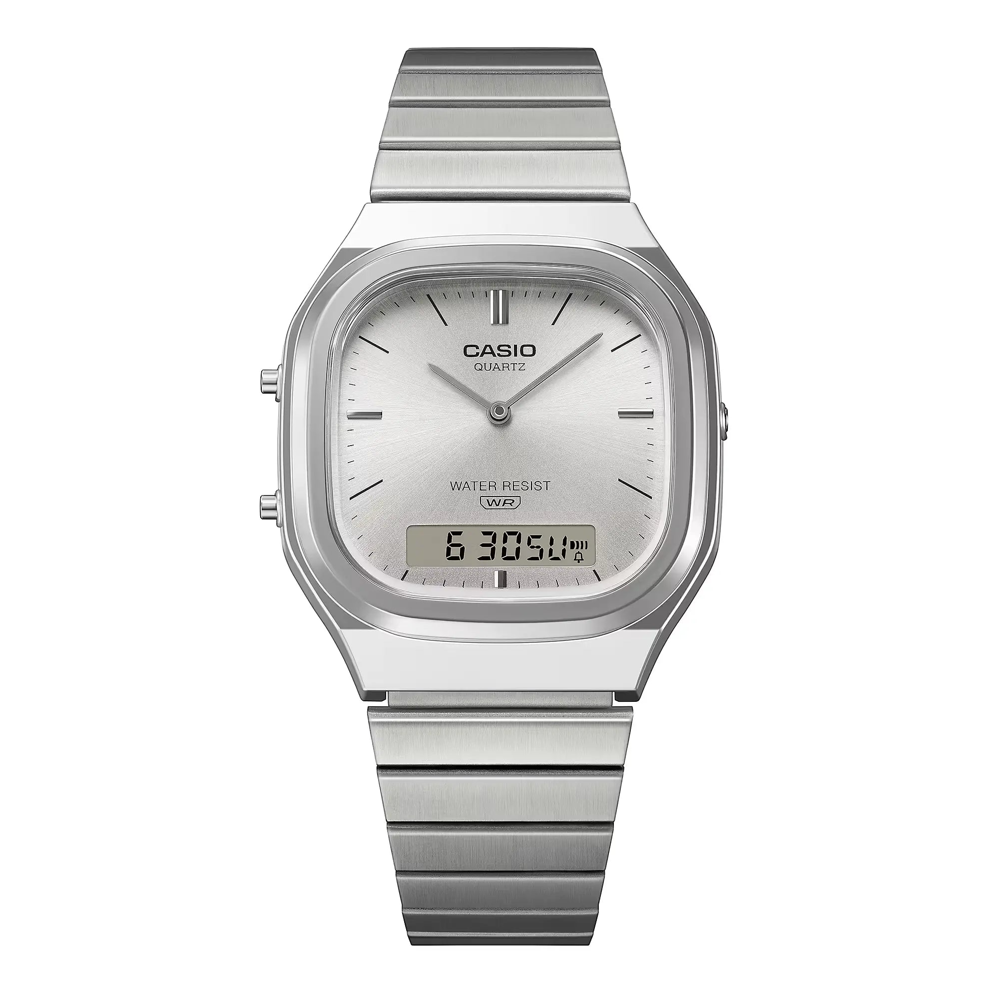 The Casio Vintage AQ240E-3A Watch features a soft rectangular case with a chrome finish and a clean analog-digital layout. A sun-ray dial and metallic index markers add depth without overpowering the design. The balanced proportions reflect Casio’s refined approach to retro styling.