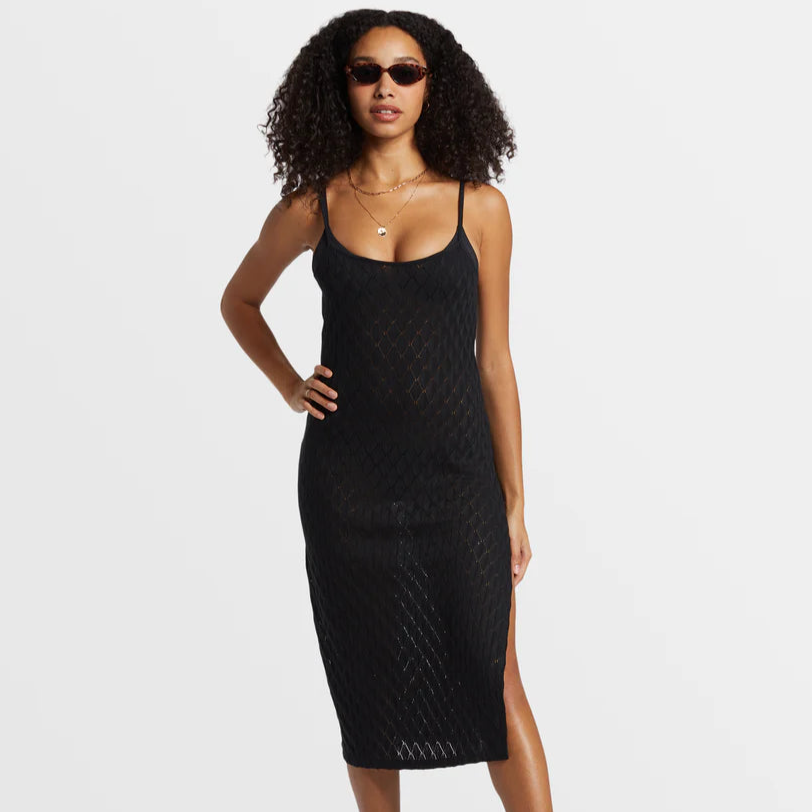 The Billabong Day Dream Dress features a diamond-crochet knit with a body-skimming fit, scoop neck, and side slit. Made from a polyester-cotton blend, this midi dress is finished with thin straps and metal plate branding.
