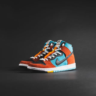 Las Nike SB Dunk High "Navajo Arts" son una obra maestra visual y cultural. El diseño de Greenwood rinde homenaje a sus raíces Diné (Navajo) a través de un rico tapiz de motivos y patrones tradicionales. La parte superior de la zapatilla presenta una combinación de naranja rugoso y azul profundo, que recuerda al paisaje desértico del suroeste. Los intrincados bordados y abalorios del talón y la lengüeta están inspirados en el arte textil Navajo, lo que demuestra la dedicación de Greenwood a la preservación y celebración de su cultura a través del diseño moderno. Los cuatro colores de las Dunk High representan las cuatro montañas que rodean Dinétah, o la tierra natal de los Navajo, y las piedras que se asocian con ellas.