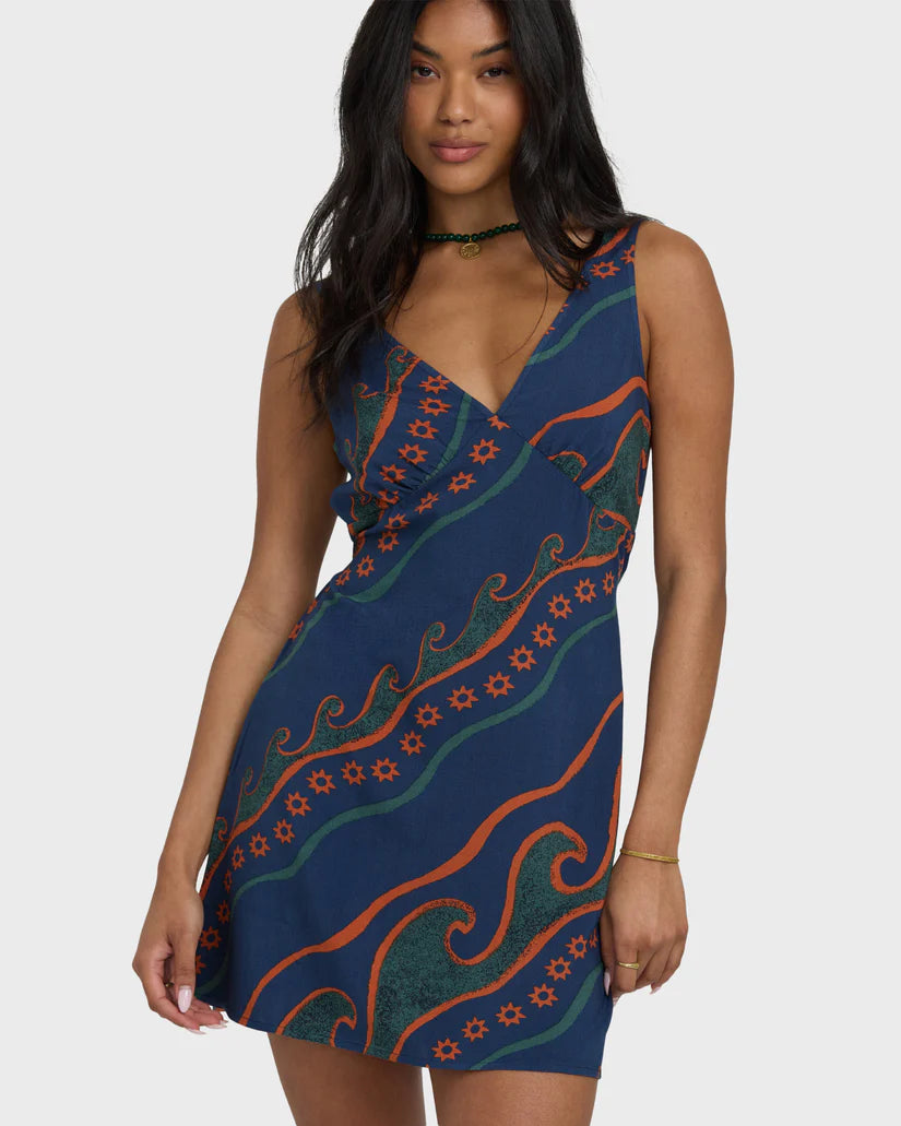 Billabong Morning Swell Mini Dress in Crisp Blue is a breezy cotton-linen blend dress made for warm, sunny days. Designed with a flattering v-neckline, back self-tie waist, and mini-length silhouette for an effortless look. Finished with a subtle metal logo plate detail.