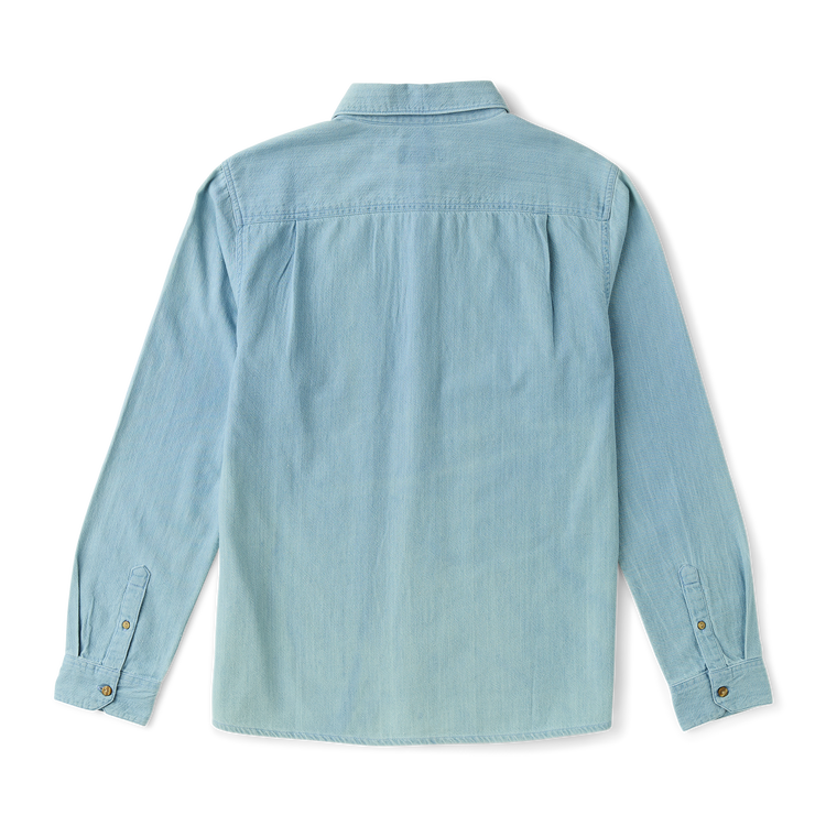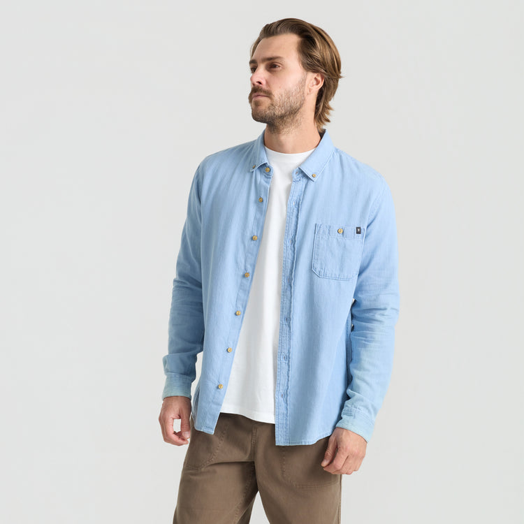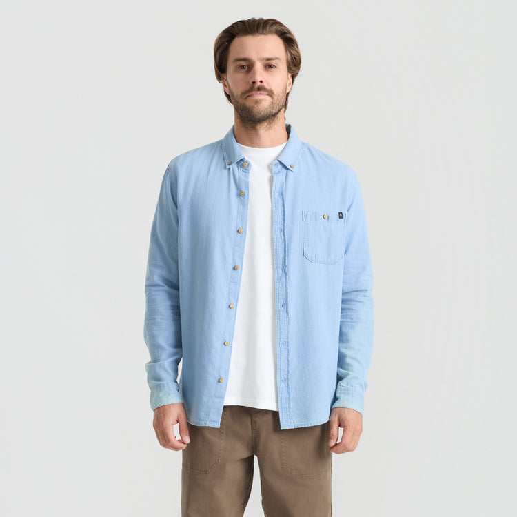 Roark Scholar Chambray Button Up Shirt in Bleached is crafted from 100% organic cotton with a twill weave for soft hand and durable structure. Designed with a button-down collar, chest pocket, and classic fit that layers easily.