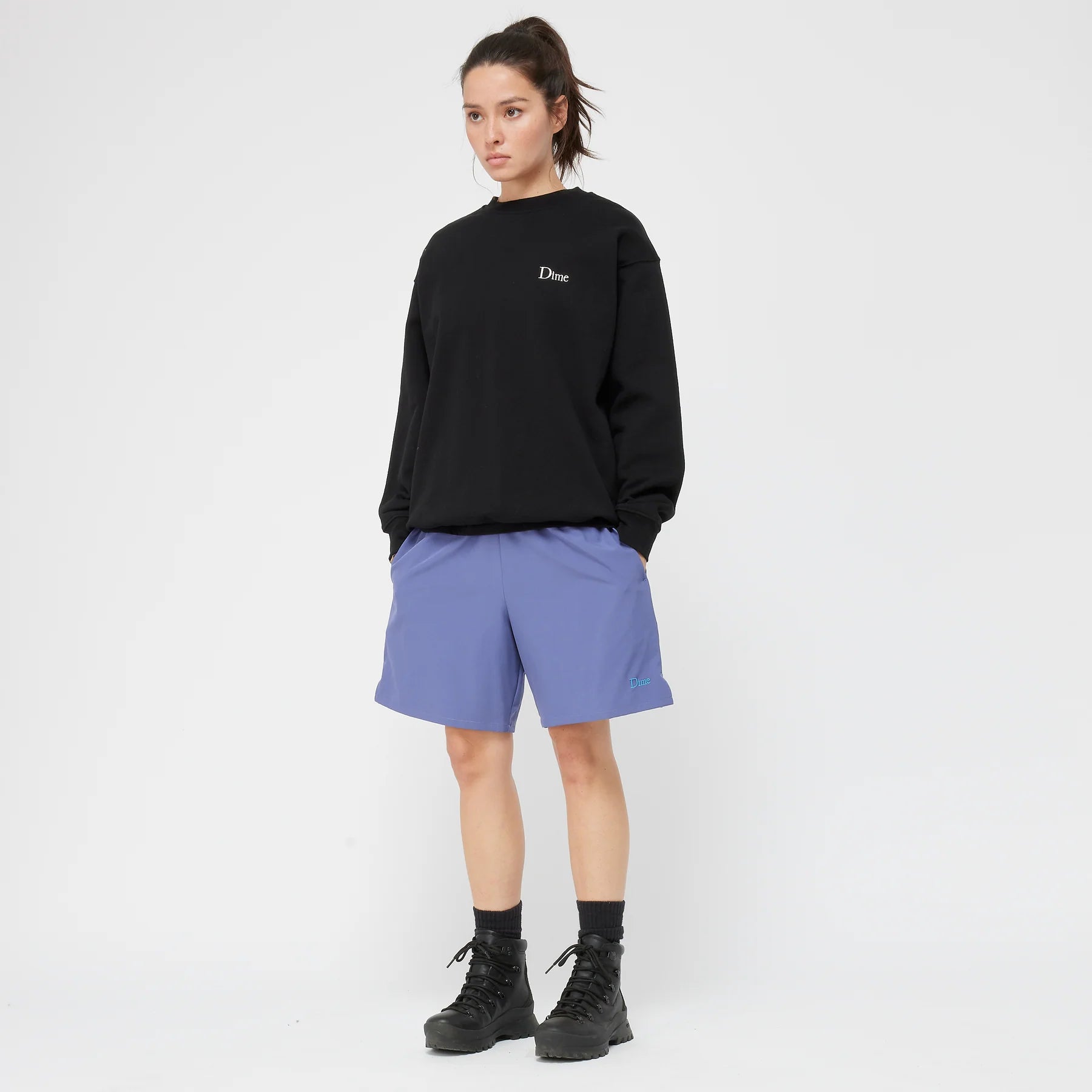 The Dime Classic Shorts in Cloud Blue combine functionality with refined style. Featuring a polyester-spandex blend, these shorts offer hidden side seam pockets, an elastic waistband with internal drawstrings, and an embroidered logo for a clean, modern look.