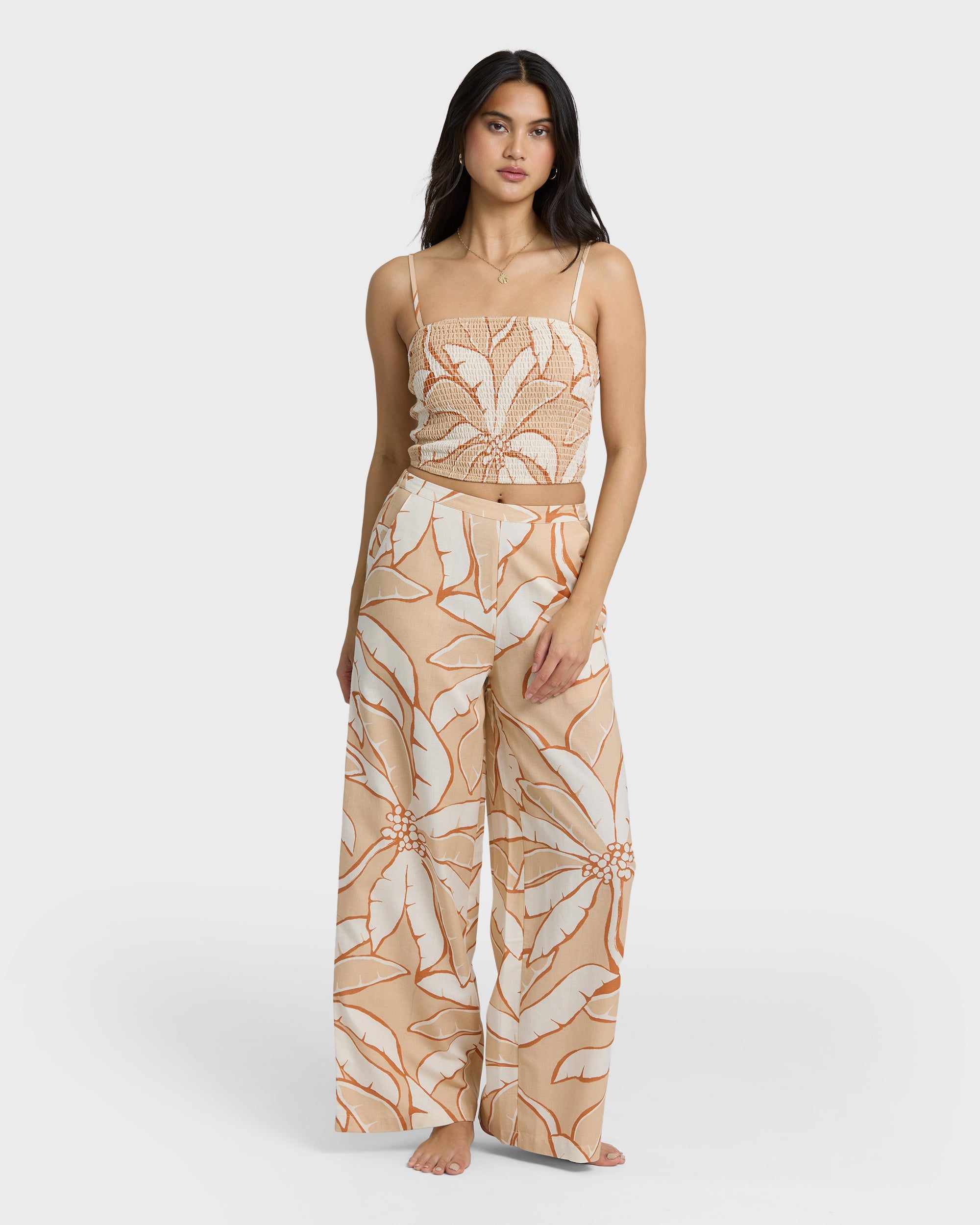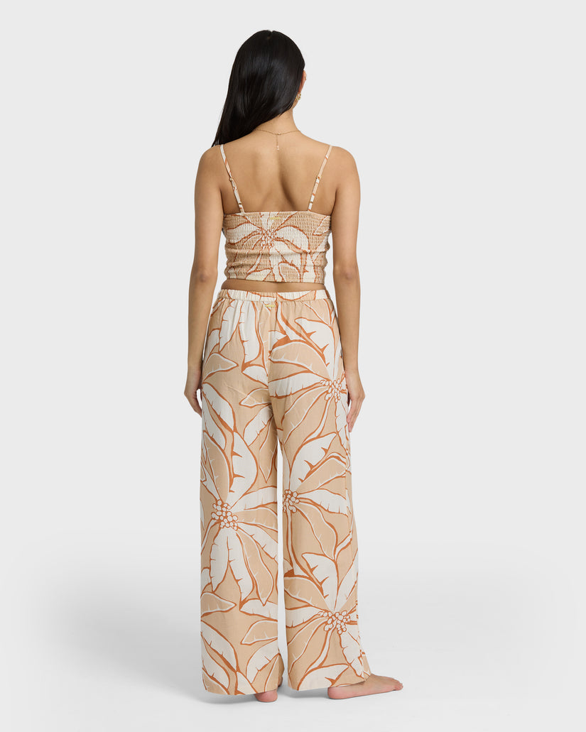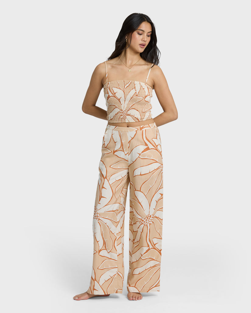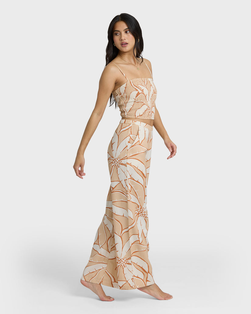 Billabong Tropic Breeze Elastic Waist Pants in Stone are full-length woven slub pants made from a viscose, cotton, and flax blend. Designed with a flat front waistband, elastic back, and side seam pockets, finished with a metal logo plate from the Des Tropiques Collection.