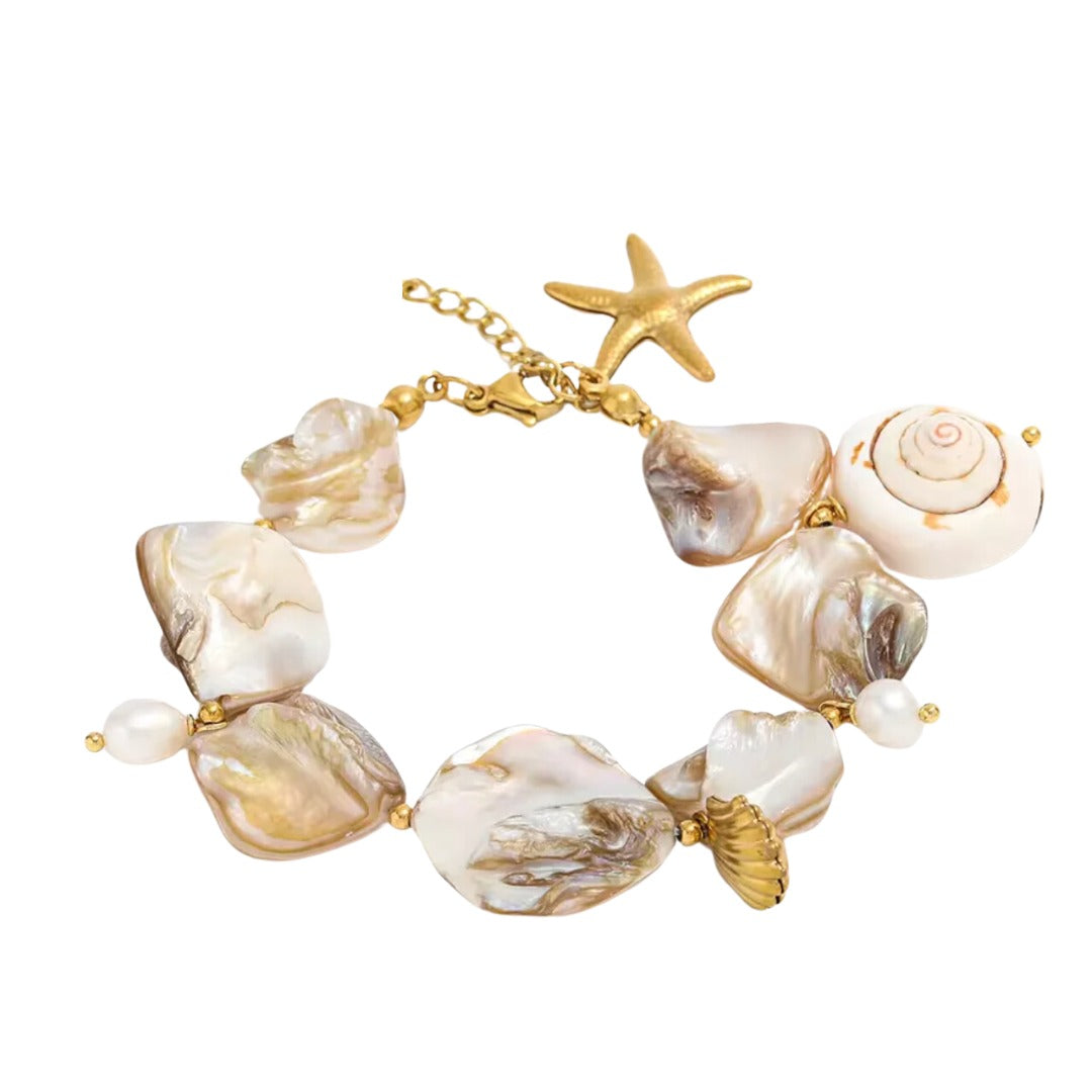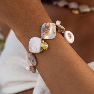 The Cove Bracelet features a smooth, shell-coated design finished in 18K gold-plated stainless steel. Water-resistant and hypoallergenic with a 7" chain and 1" extender for a comfortable fit.