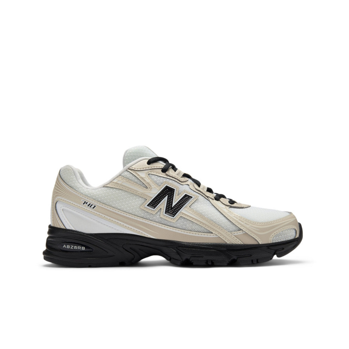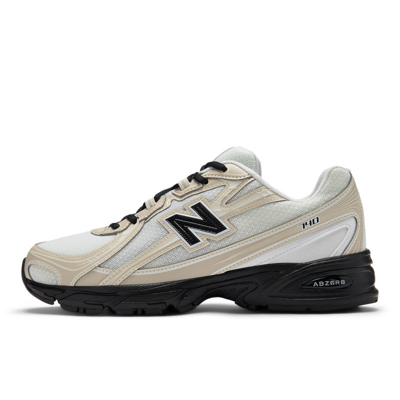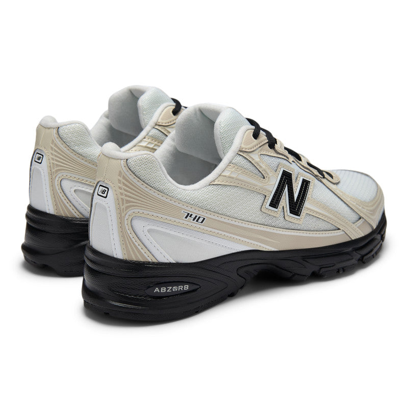 Trendy running sneakers featuring mesh and leather-look construction with New Balance branding on the sides, heel, and tongue. The 740 logo appears laterally, while heel reinforcement and leather-look inserts add durability. ABZORB technology absorbs shocks by combining cushioning and compression resistance for all-day comfort.