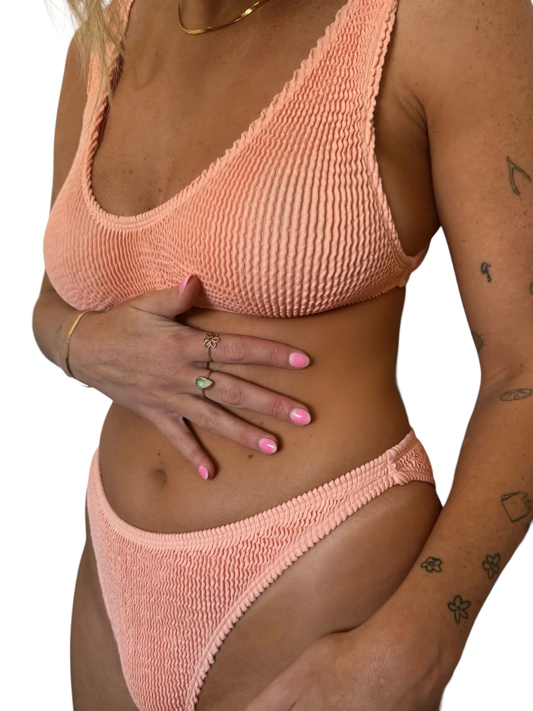 The Lokal Lyndsi Swim Bottom in Nectar offers a bit more coverage with the flexibility to wear low or high on the hips. Made from super soft ribbed material, it fits sizes XS-L comfortably and pairs perfectly with the Paige Top or any other.