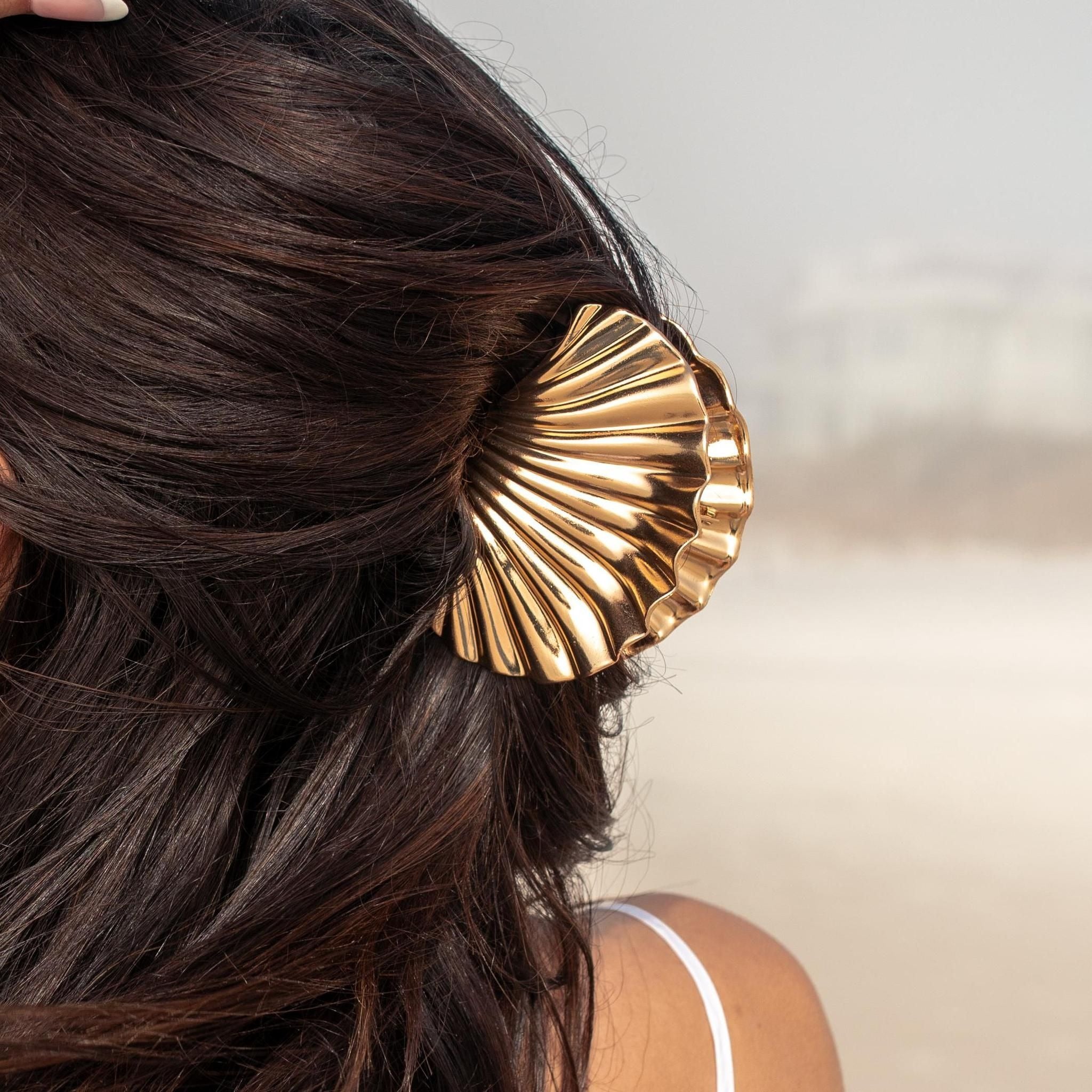 The Marella Hairclip in Gold is crafted from water-resistant metal for durability and style in humid or coastal settings. A simple, elegant shape designed to hold strong through beach days and travel alike.