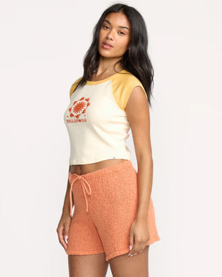 The Billabong Beach Club Babe Short Sleeve Tee in Butter features a fitted raglan cut with contrast sleeves and bold front artwork. Made with soft, sun-washed cotton rib for a casual, lived-in feel. Available now at Drift House.