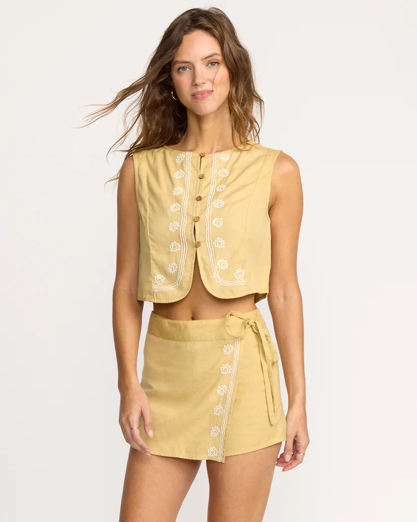 The Billabong Your Crush Skort in Light Olive features a fitted wrap design with tie and zip closure for easy wear. Made from soft slub fabric with embroidered accents and a 12.5-inch hem. Available now at Drift