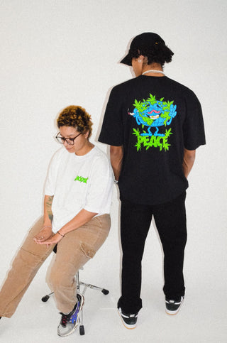 The Drift House World Peace Tee in white combines lasting comfort with thoughtful design. Made from 100% USA cotton, it features a heavyweight, broken-in feel with a generous fit and higher neckline. A timeless piece from the 4/20 collection honoring unity and sustainability.