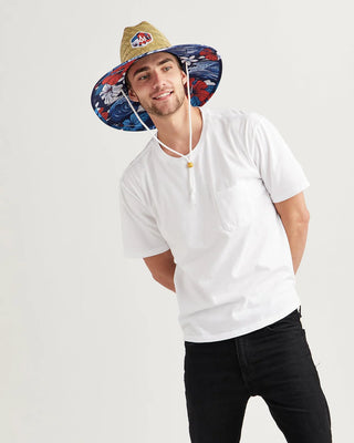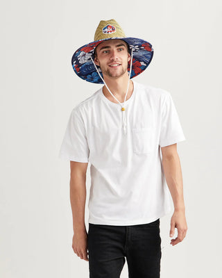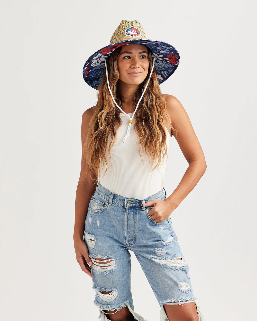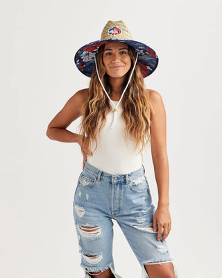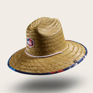 The Hemlock Hat Co. Midway Lifeguard Hat brings classic sun coverage with a tall cattleman crown and wide 4.5" brim. Made from 100% straw and lined with a UPF 50+ under-brim featuring a patriotic floral print, it offers breathable shade with a standout look.